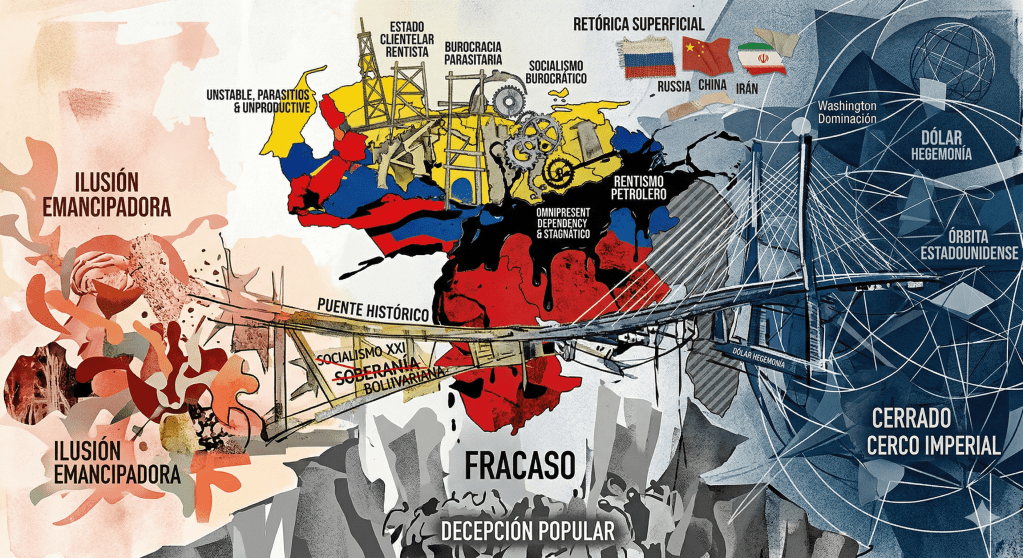 Desde hace más de una década he sostenido, en artículos, conferencias y trabajos de investigación, que la llamada Revolución Bolivariana nunca rompió con el núcleo material del viejo orden venezolano: el capitalismo rentista petrolero. Bajo un ropaje discursivo “socialista” y “antiimperialista”, el chavismo operó en la práctica como un Estado clientelar cuyo objetivo real era administrar, distribuir y exprimir la renta petrolera para sostener una estructura de poder burocrática, parasitaria e improductiva. Hoy la evidencia es abrumadora: lejos de consolidar una soberanía económica y geopolítica, este modelo terminó dejando a Venezuela más vulnerable, más dependiente y con menor capacidad de maniobra frente a Estados Unidos. Mi tesis, que ahora formulo de manera explícita y sistemática, es la siguiente: